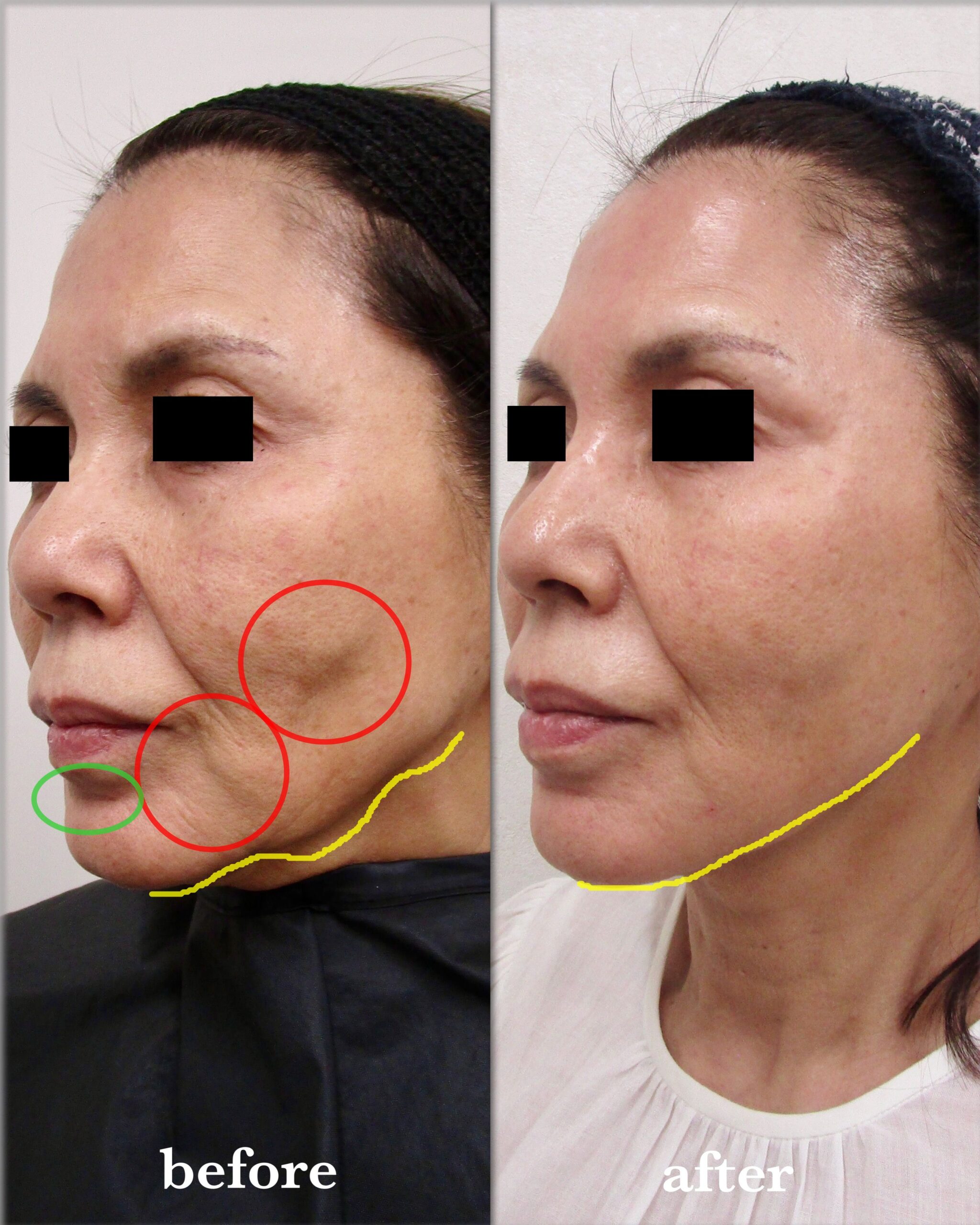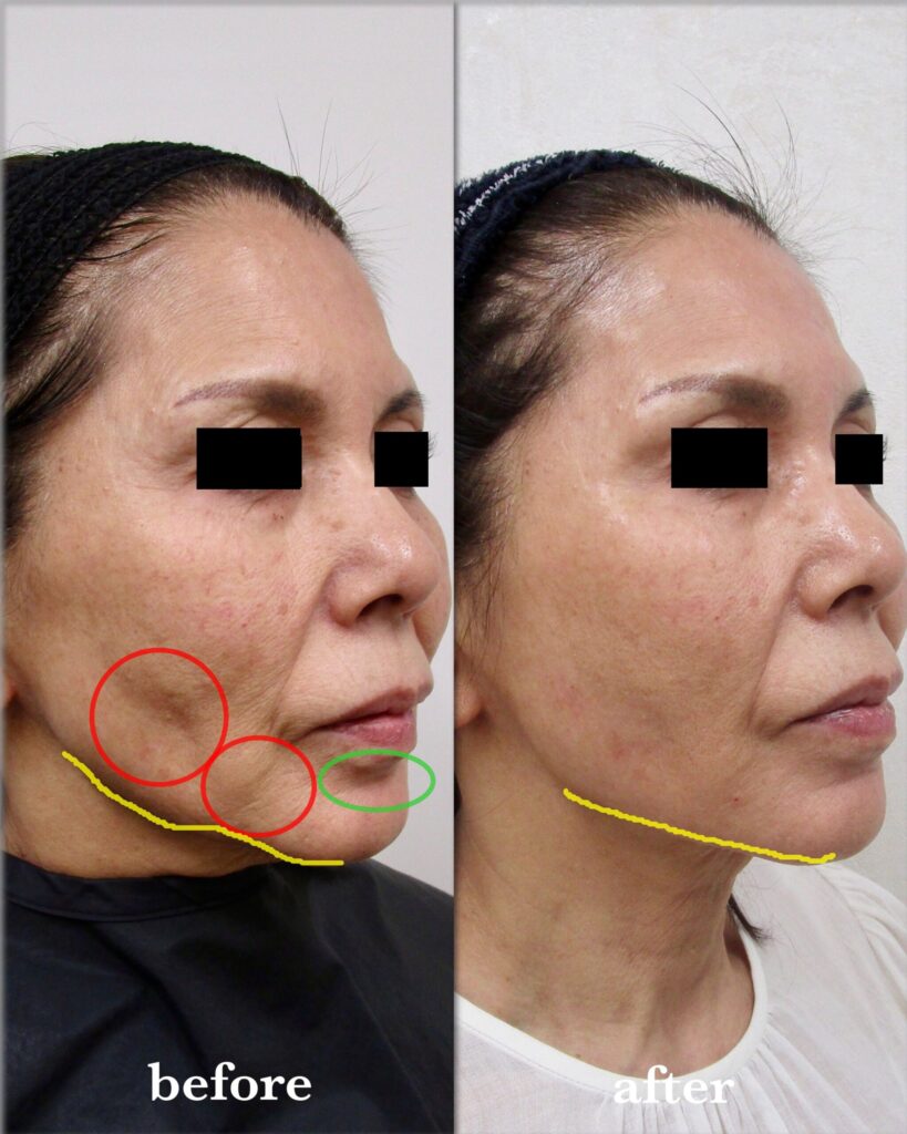 波打ったような頬の凹みや、マリオネットラインの「ぽにょ」(赤丸印)が滑らかになり