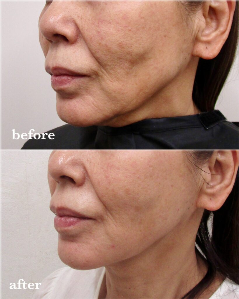 面で形を補整し、皮膚の厚みを増すことでマリオネットラインを下からサポートすることができます。